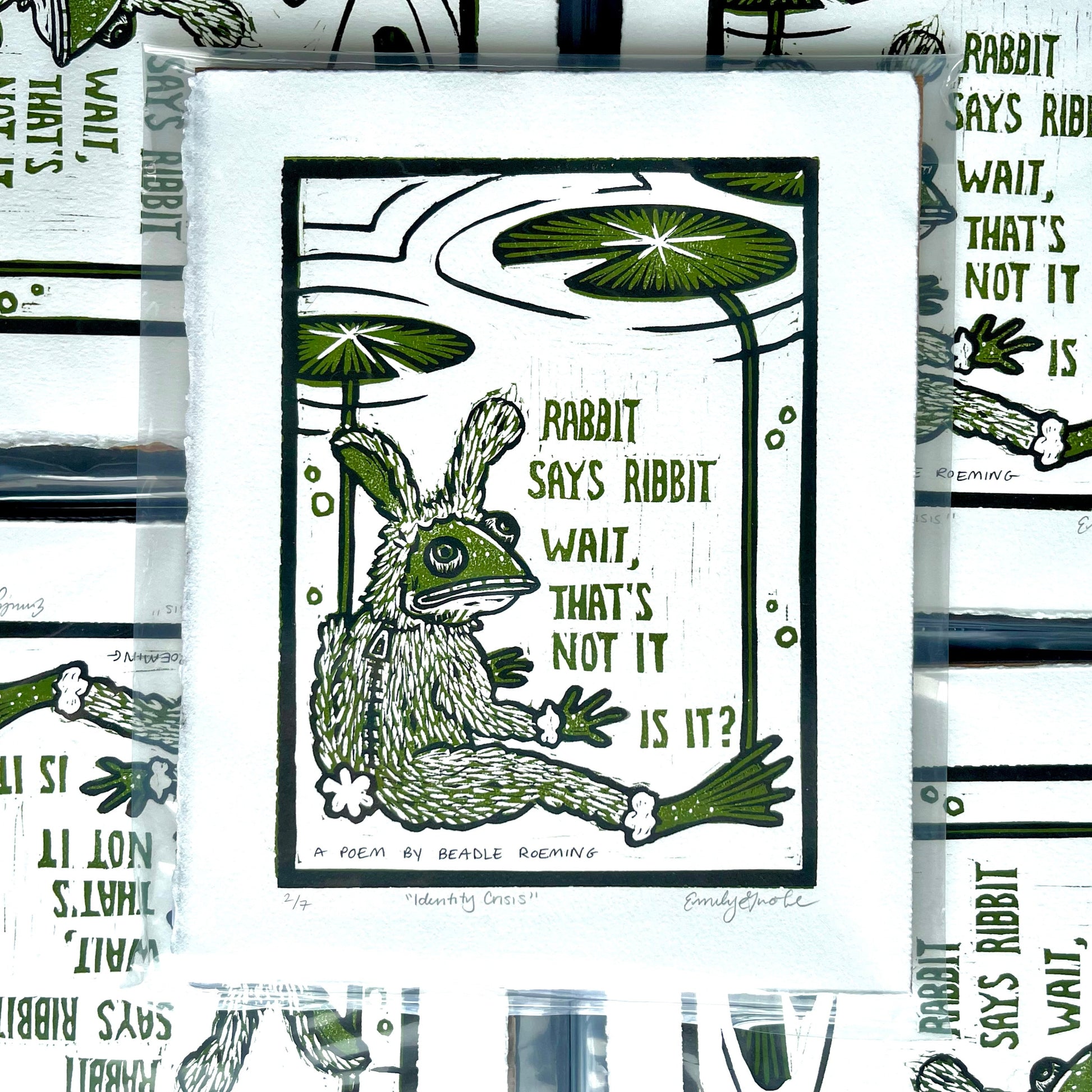 Identity Crisis is a two block hand-carved linoleum print, on 8x10" BFK Rives paper.